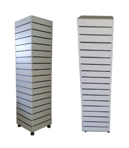 Gôndola Torre Quadrada De Chão com Rodas - 1,90 m Altura x 45 cm Largura x 45 cm Comp. - Canaletas de PVC nos Trilhos - Painel Canaletado MDF18 Branco - 68 trilhos de 45 cm