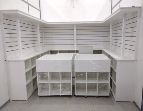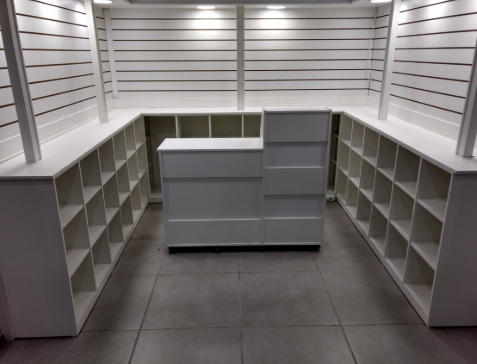 - Gondolas de chão com rodas de MDF nos dimensionais exigidos pelos espaços existentes;